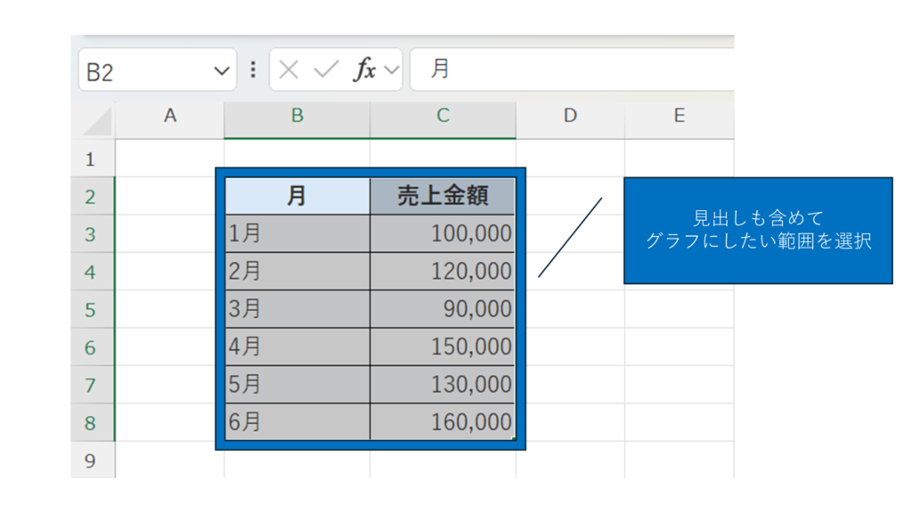 「月」や「売上金額」の見出しも含めて選択すると、項目名が自動で反映されます。