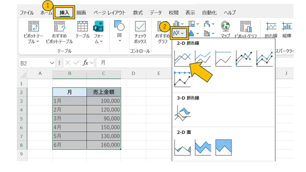 ② [挿入]タブ → [グラフ] → [折れ線]をクリック