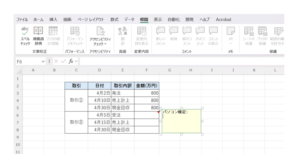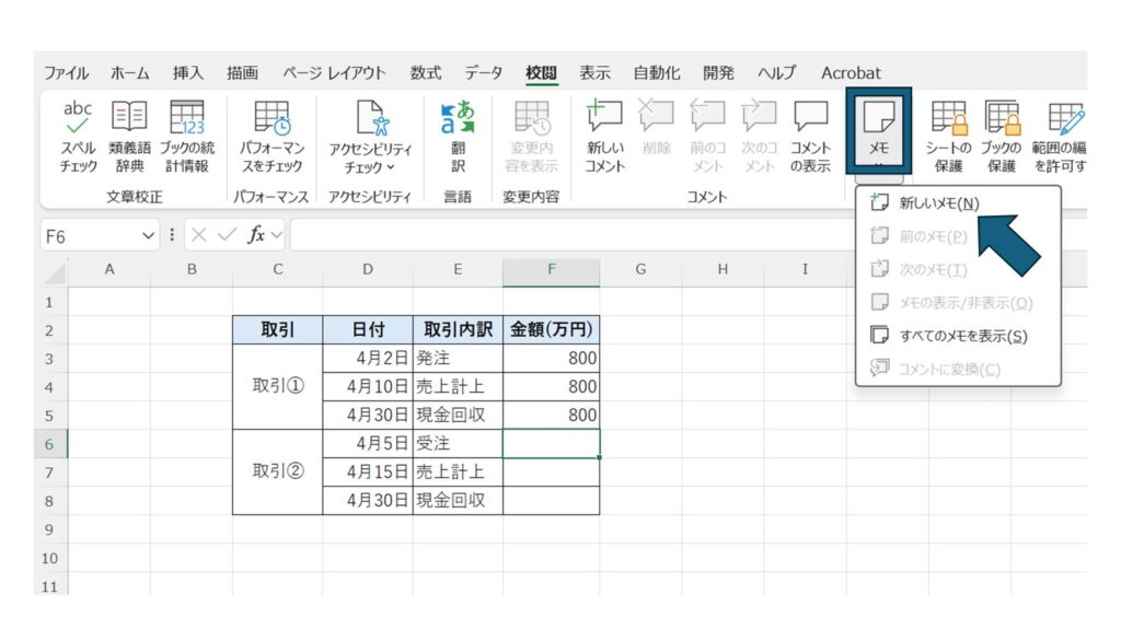 「校閲」タブの中にある「メモ」をクリックし、その中の「新しいメモ」を選択します。すると、セルの横にメモ入力欄が表示されます。