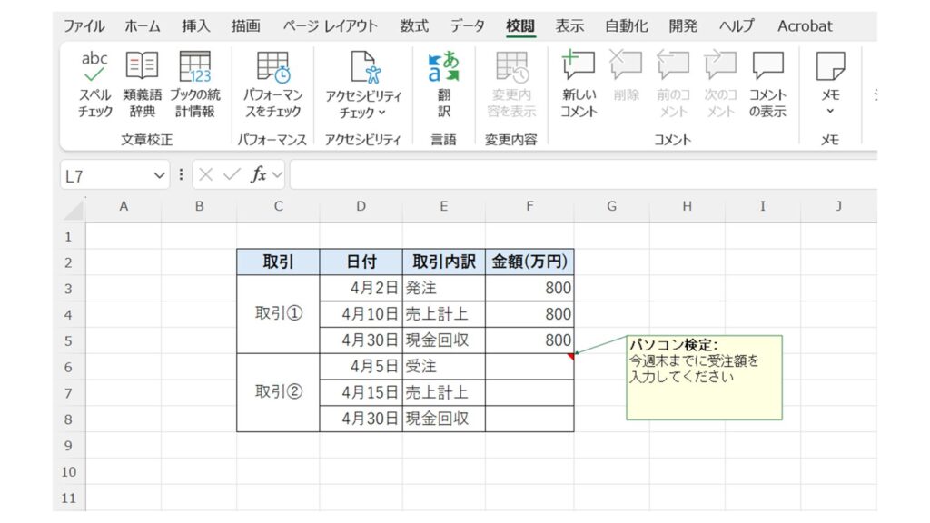 表示されたメモ欄に、補足説明や注意点などを入力します。入力後にセルの外をクリックするとメモが保存されます。