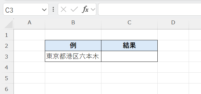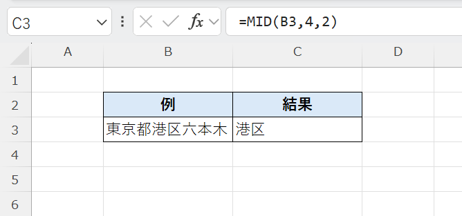 この式は、セルB3に入力されている「東京都港区六本木」から一部の文字を取り出しています。