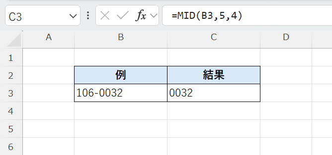 MID関数は、文字列の中から指定した位置から任意の文字数を抜き出す関数です。