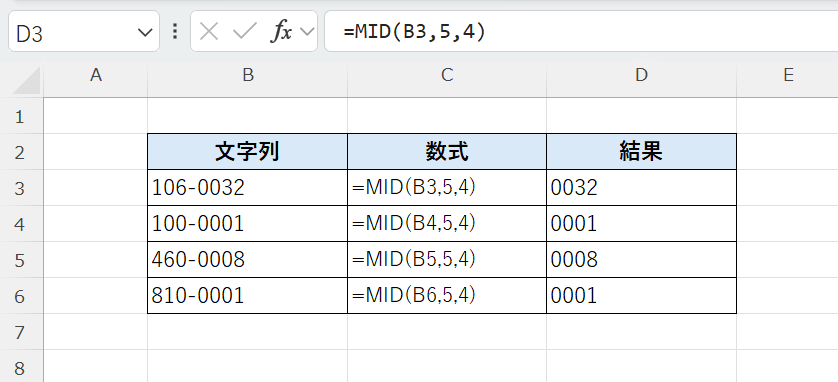 =MID(文字列, 開始位置, 文字数)