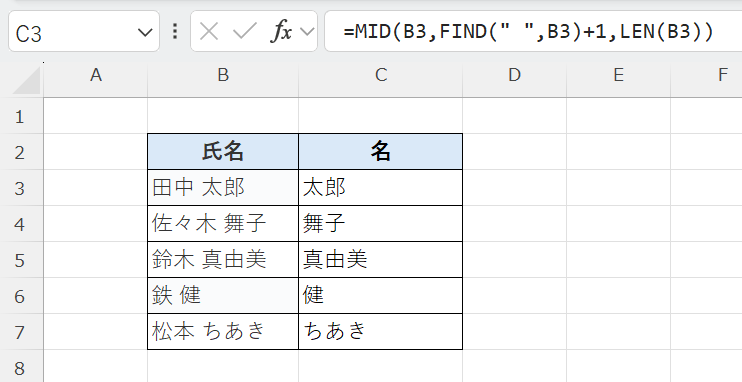 → このように「氏名」の形式から「名」だけを取り出すことができます。
