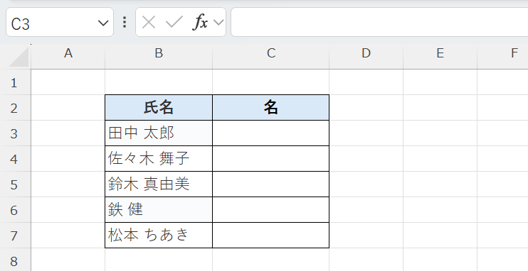 1. 名前の「名」だけを取り出す(姓と名の間にスペースがある場合)
