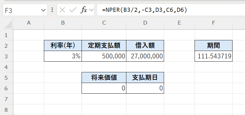- 結果は「回数」で返されるため、年数に直すには÷支払い回数(例:÷12) を行う。