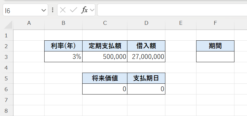 =NPER(利率, 定期支払額, 現在価値, 将来価値, 支払期日)