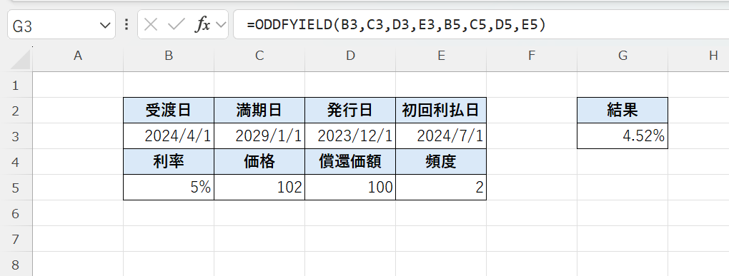 ODDFYIELD関数は、初回利払期間が不規則な債券の利回りを求める関数です。