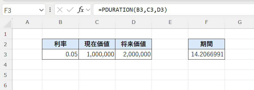 PDURATION関数は、一定の利率で資金を運用した場合に、現在の金額が将来の目標金額に達するまでの期間を求める関数です。