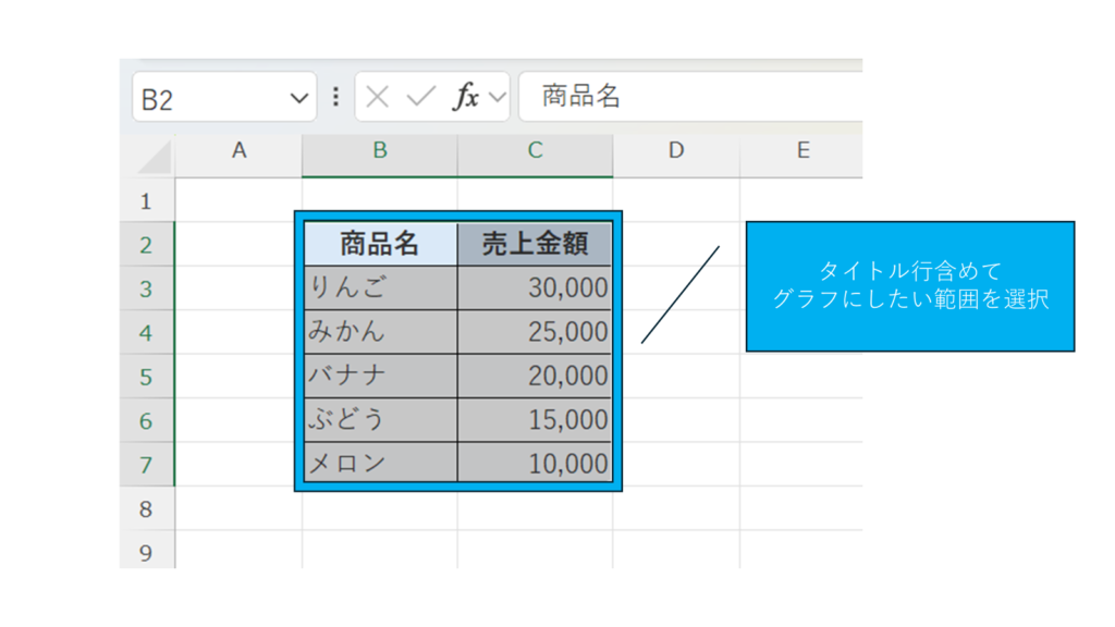 タイトル行(商品名・売上金額)も含めて選ぶのがポイントです。