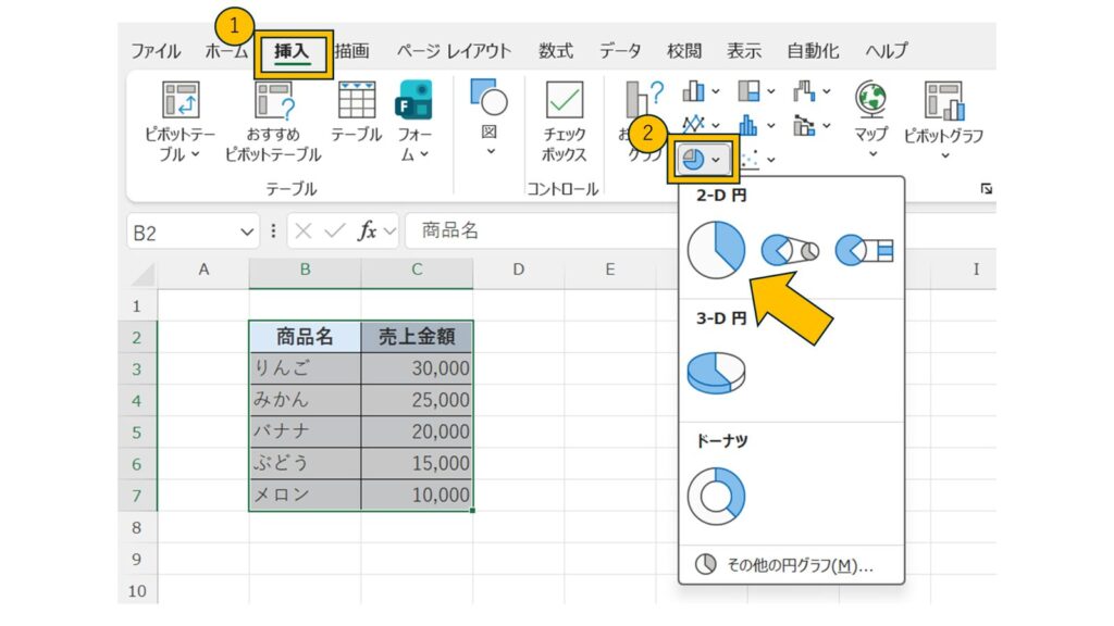 ② [挿入]タブ → [グラフ]グループ → [円] をクリック