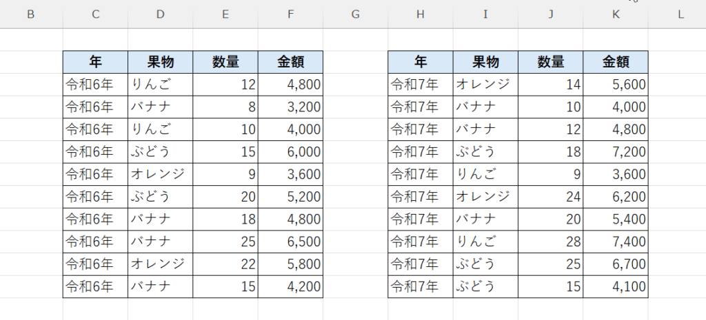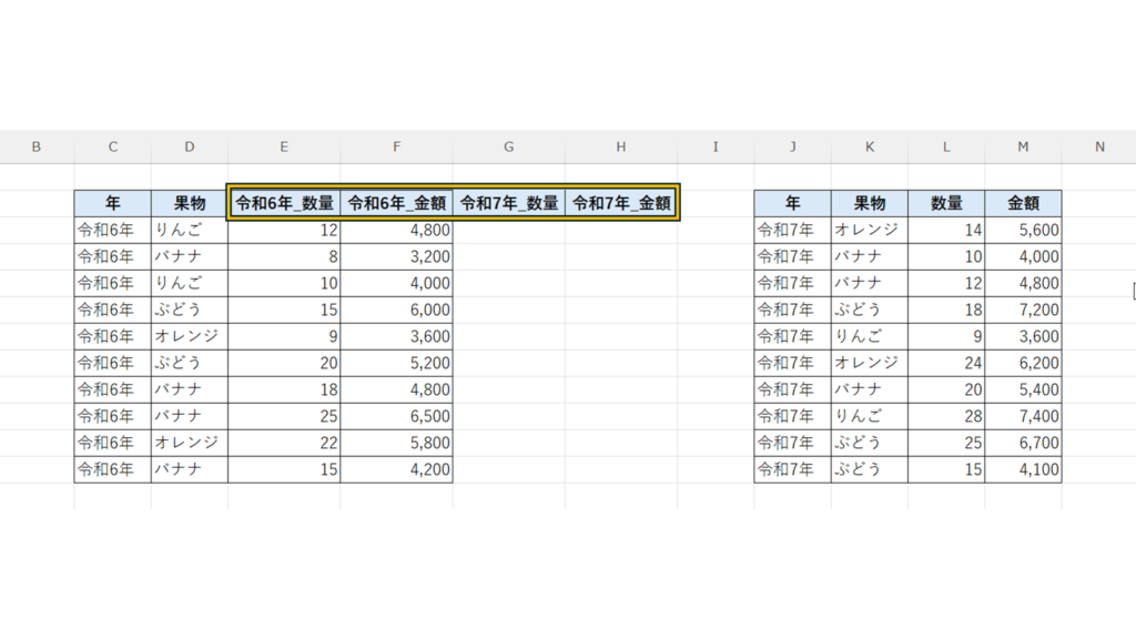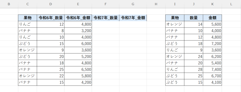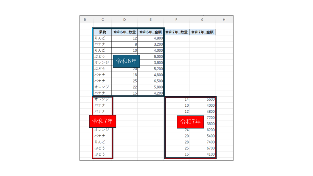 令和6年のデータの同列直下に令和7年の「果物」のデータを貼り付けます。数量と金額も令和6年のデータの下「令和7年_数量」、「令和7年_金額」の列にそれぞれ貼り付けます。
