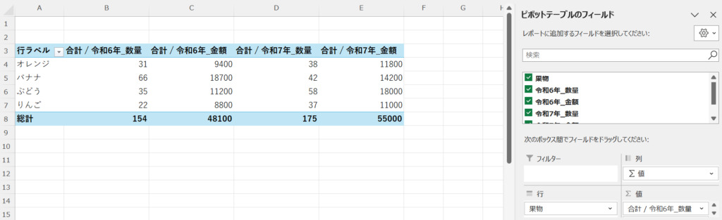 - 値エリア:「令和6年_数量」、「令和6年_金額」、「令和7年_数量」、「令和7年_金額」