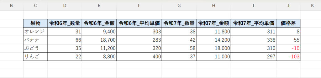サンプルデータ(令和6年・令和7年の果物の価格)