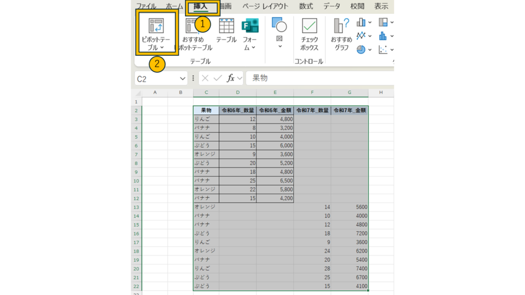このデータを使って、果物ごとに「令和6年と令和7年の価格」を比較するピボットテーブルを作成します。