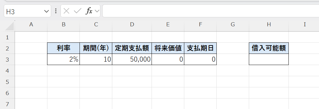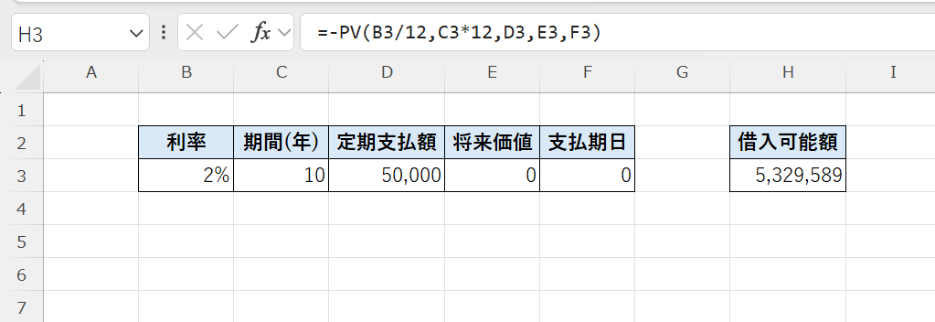 ここでは、年利2.4%で毎月5万円を10年間返済する場合の、借り入れ可能額をPV関数を使って求めてみましょう。