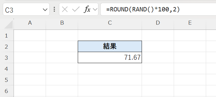 このようにROUND関数と組み合わせることで、小数点以下2桁に丸めた乱数を作ることができます。