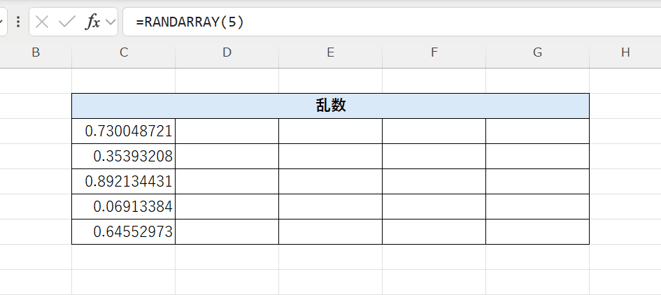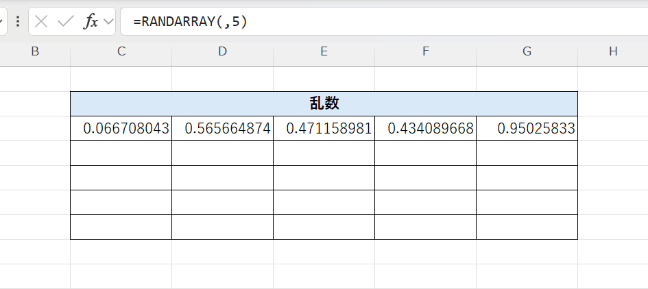 👆 この場合、最初の引数 [行数] が空白なので既定値「1」が使われ、1行 × 5列 の範囲に、0~1のランダムな小数を自動生成するという意味になります。