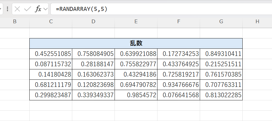 RANDARRAY関数 は、指定した行数・列数に基づいてランダムな数値を自動的に生成する関数です。