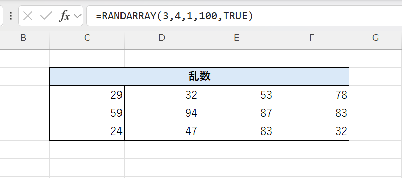 このように、指定した範囲内のランダムな整数(最小値1, 最大値100)が3行×4列に展開されます。