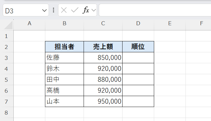 売上データから、担当者の順位をRANK.AVG関数で求めてみましょう。
