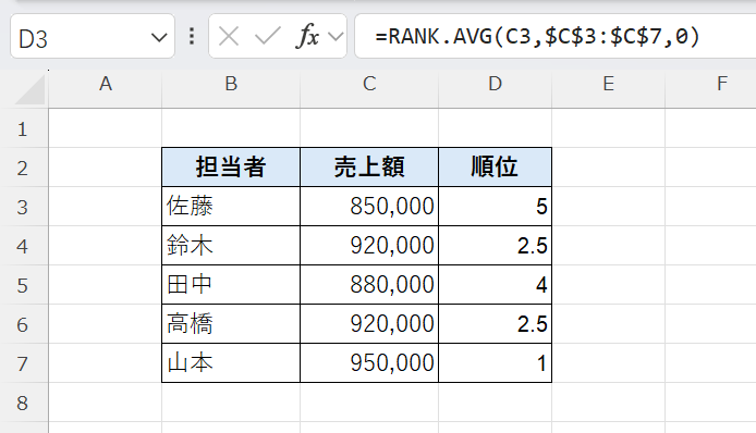 RANK.AVG関数では「2.5位」と順位の平均値で表現されるのが特徴です。