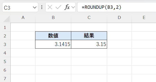 第2引数が「2」なので、小数第2位まで残してそれ以降を切り上げます。