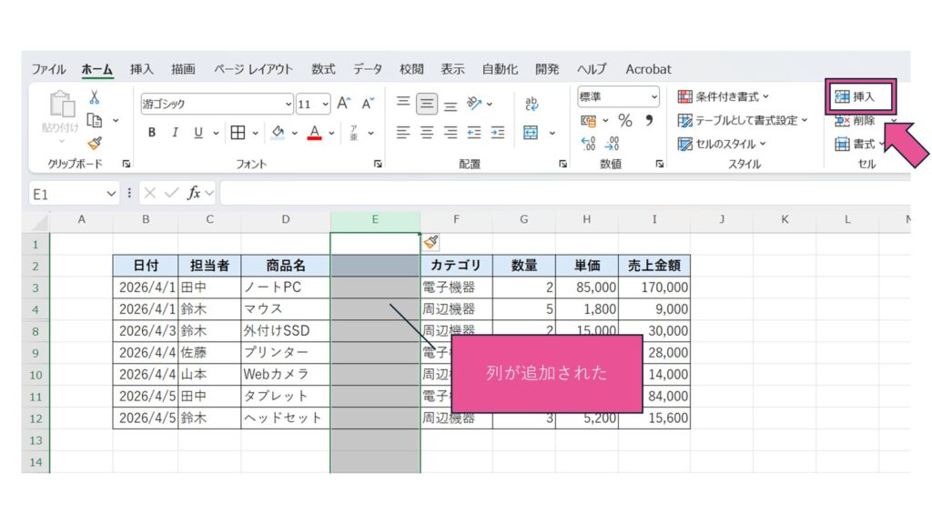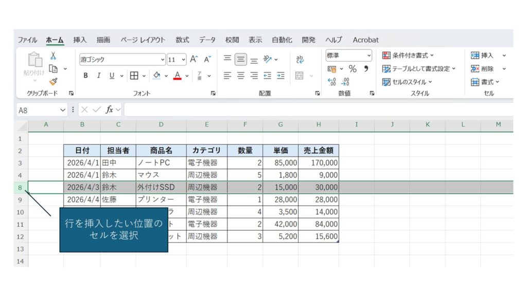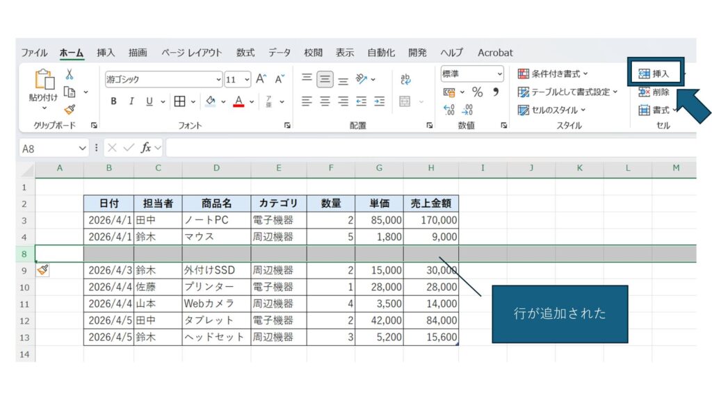 次に「ホーム」タブをクリックし、「挿入」を選択します。ここで「シートの行を挿入」または「シートの列を挿入」をクリックすると、新しい行や列が追加されます。