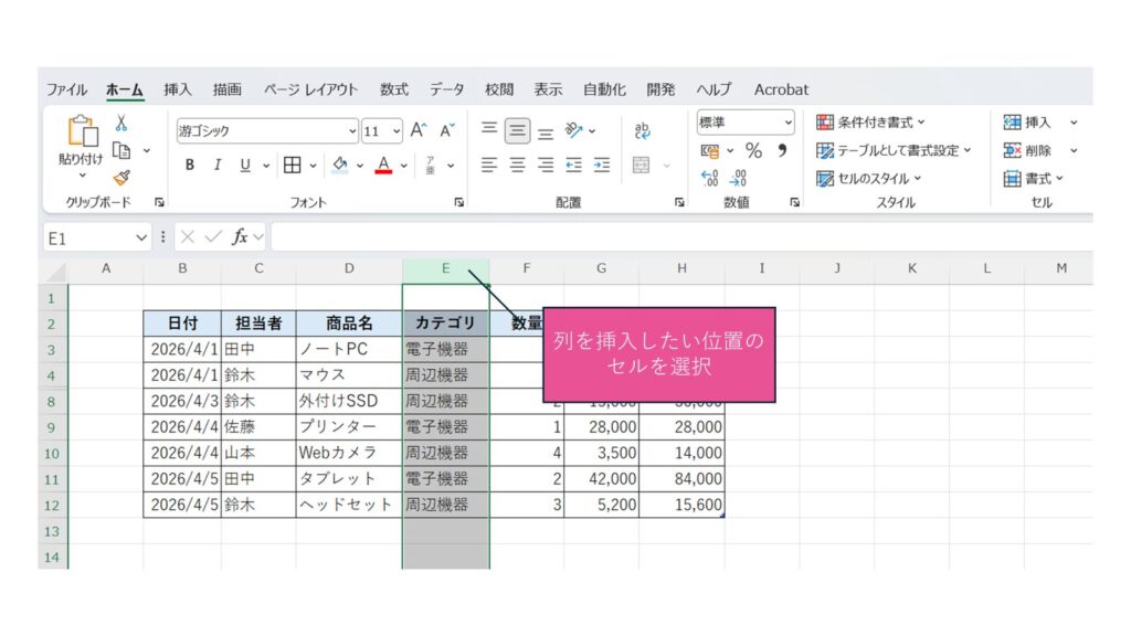 挿入したい位置の行番号または列番号を選択し、右クリックします。表示されるメニューから「挿入」をクリックすると、新しい行や列が追加されます。