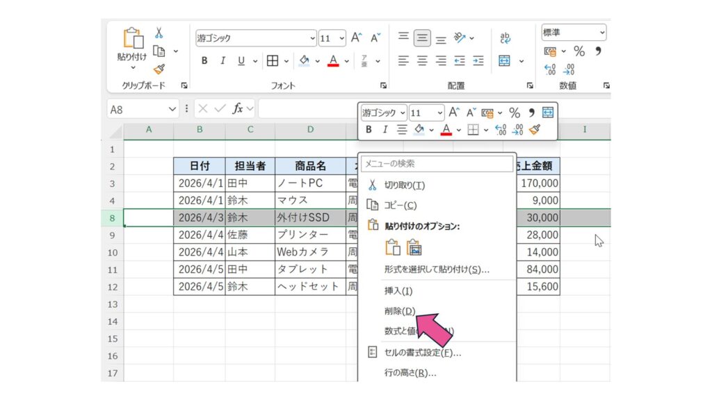 削除したい行番号または列番号を選択し、右クリックします。表示されるメニューから「削除」をクリックすると、行や列を削除できます。
