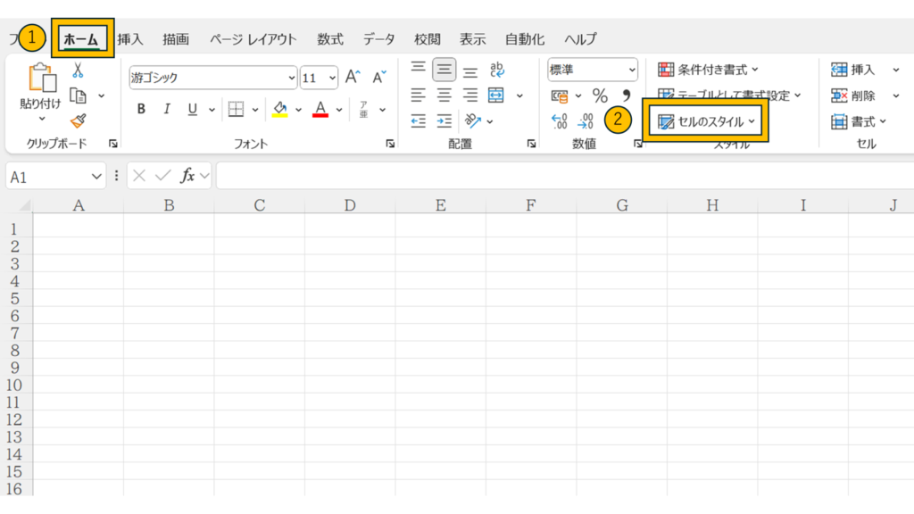 「スタイル」グループ内にある [セルのスタイル] をクリックします。