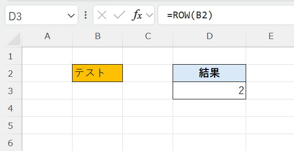 「テスト」のセルB2は2行目にあるため、2 が返されます。