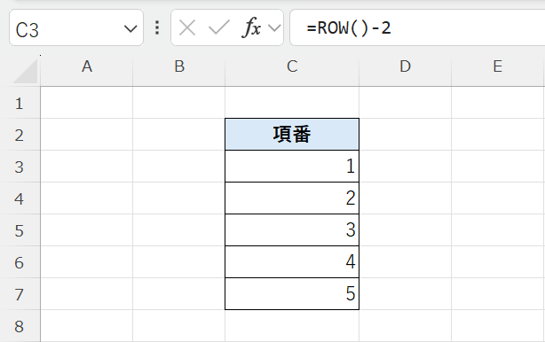 セルC3は3行にあるため、3 が返されます。そこから -2 することで結果を 1 になるように調整しています。あとは、下方向に数式をコピーするだけで、行番号がそのまま連番として使えます。