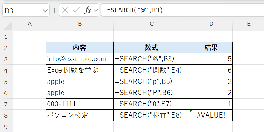→ SEARCH(“検査”, “パソコン検定”) → 見つからないため #VALUE!