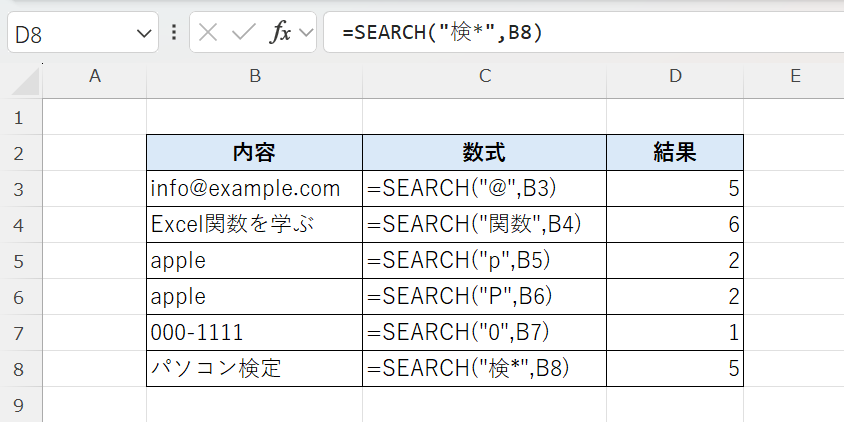 その結果、SEARCH関数は 「パソコン検定」の5文字目に一致が見つかったと判断し、返り値は 5 になります。