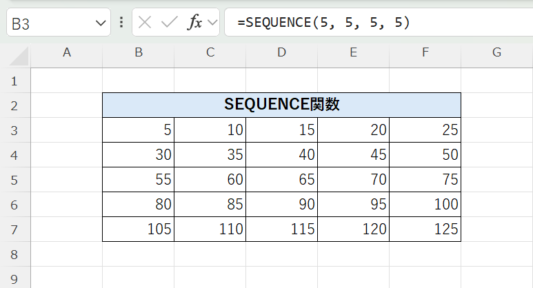 SEQUENCE関数 は、指定した行数・列数・開始値・増加単位に従って、