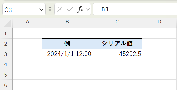たとえば 2024/1/1 12:00 は、45292.5 というシリアル値で表現されます。