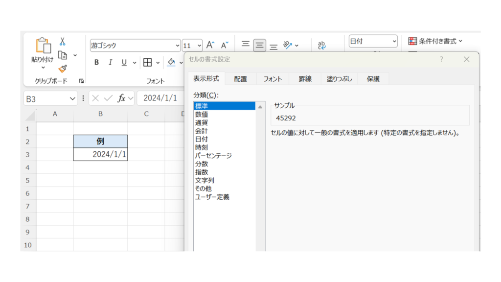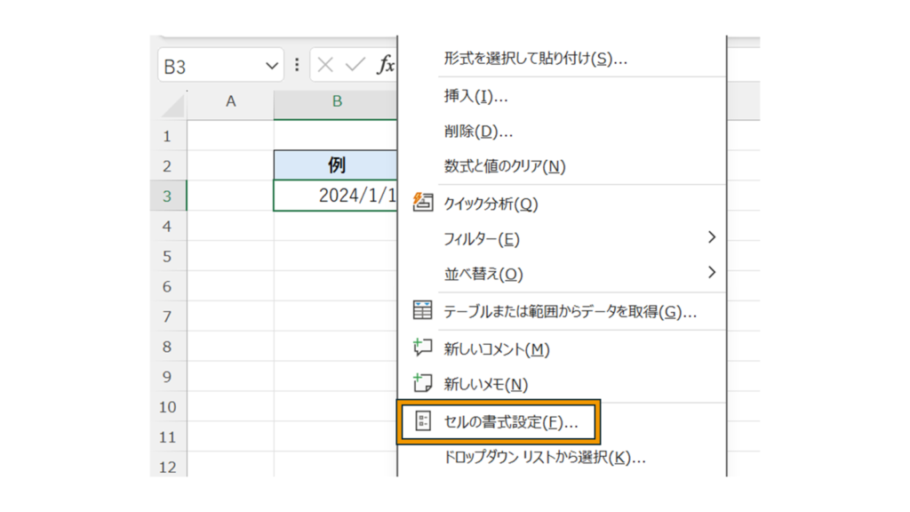 「2024/1/1」などの日付が入力されているセルを選択し、右クリックして「セルの書式設定」を開きます。