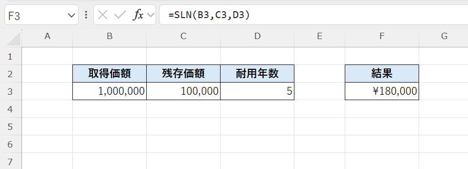 =SLN(取得価額, 残存価額, 耐用年数)
