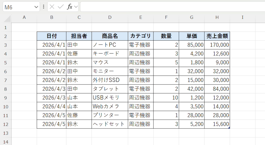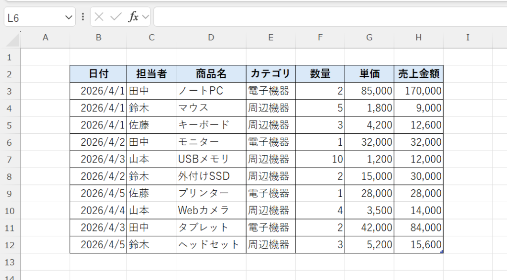 ここでは、売上データを使って「日付を古い順+同じ日付なら売上金額の大きい順」に並び替える方法を解説します。