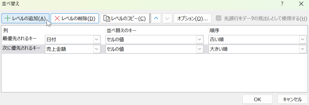 複数条件を設定することで、「日付ごとに整理しつつ、売上の大きい順に並べる」といった操作が可能です。
