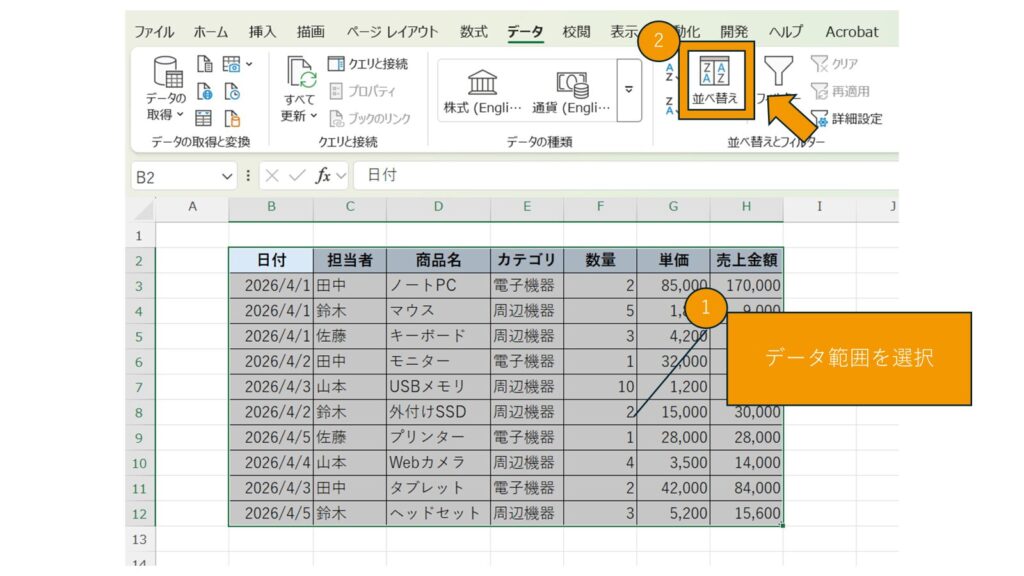 データ範囲(見出しを含む)を選択し、「データ」タブ → 並び替え をクリックします。