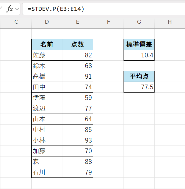 このとき、点数のばらつき(標準偏差)を求めるには次の式を入力します。