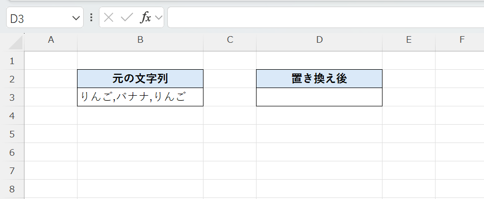 たとえば、セルB3に「りんご,バナナ,りんご」と入力されているとき、文字列の「りんご」を「みかん」に置き換えるには、次のように入力します。