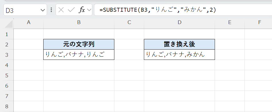 =SUBSTITUTE(B3,"りんご","みかん",2)