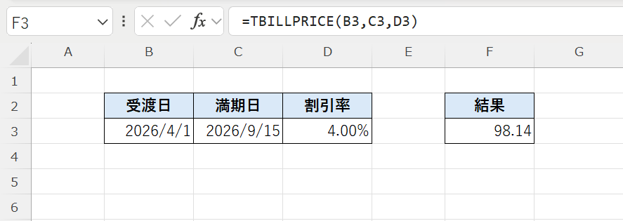 短期国債は満期時に100で償還されるため、TBILLPRICE関数はそこから割引率分を差し引いて、現在価格を計算します。割引率が高いほど現在価格は低くなり、割引率が低いほど現在価格は100に近づきます。