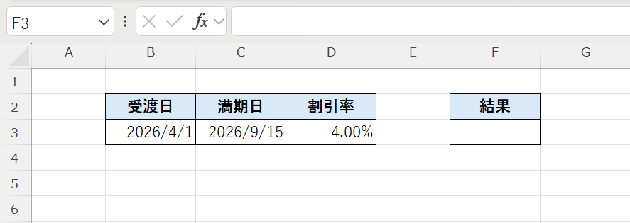 この式では、受渡日が2026年4月1日、満期日が2026年9月15日、割引率が4%の短期国債について、額面100あたりの価格を求めています。