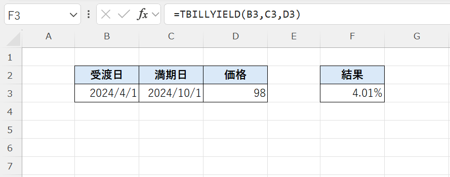 TBILLYIELD関数は、受渡日と満期日、価格をもとに、短期国債(T-Bill)の利回りを求める関数です。