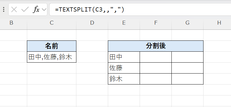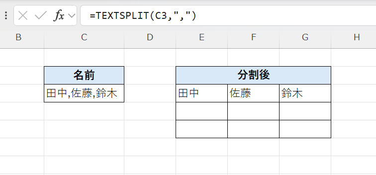 結果が展開される | 分割結果が複数セルに自動で展開(スピル)される |