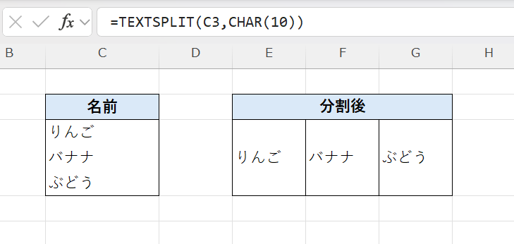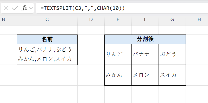 そこで活躍するのが TEXTSPLIT関数 です。